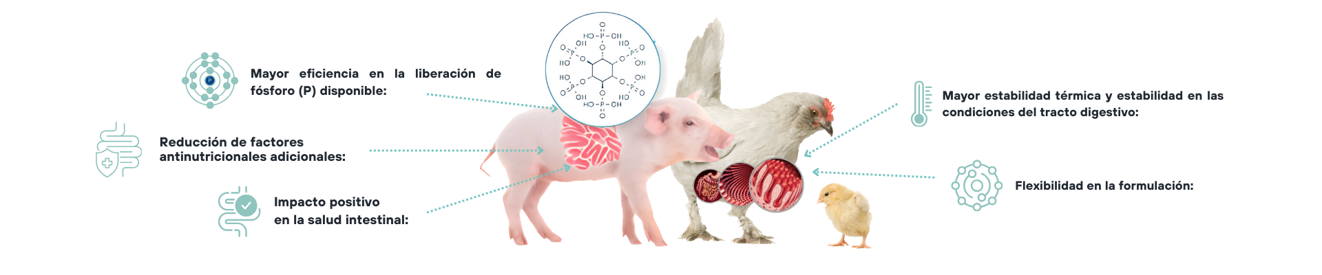 Fitasa termoestable y resistente a pH bajo que hidroliza el fitato de las semillas, liberando fósforo y minerales esenciales como calcio, zinc, hierro y magnesio. Reduce los efectos antinutricionales de los inositol fosfatos, favorece la salud intestinal y ofrece flexibilidad en dietas con alto contenido de fitato sin comprometer el rendimiento nutricional.
